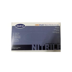 Medral VinciFlex Black Nitrile Gloves offer superior protection with a powder-free and latex-free design. These single-use examination gloves feature textured fingers for enhanced grip, a beaded cuff for easy wear, and a non-sterile build suitable for medical, industrial, and general use. Each box contains 100 durable gloves that fit either hand.